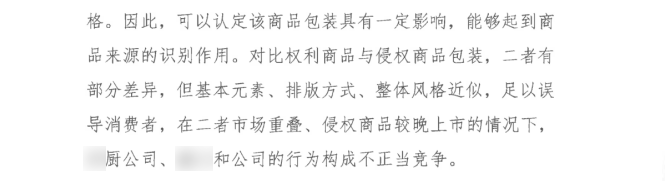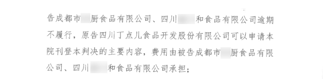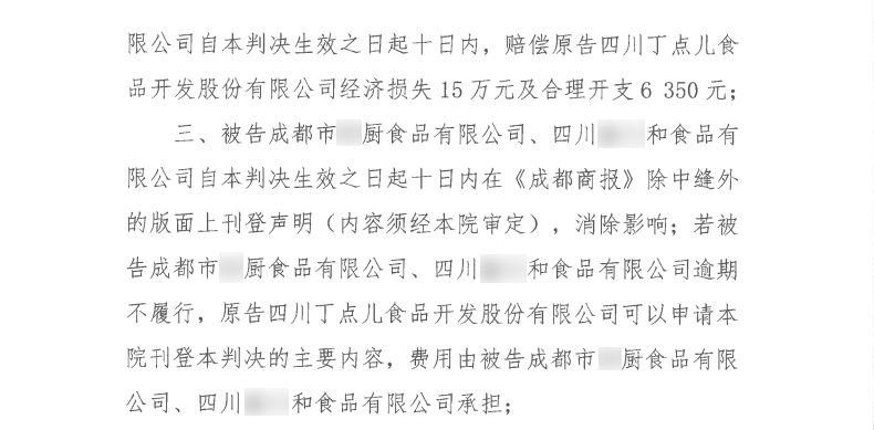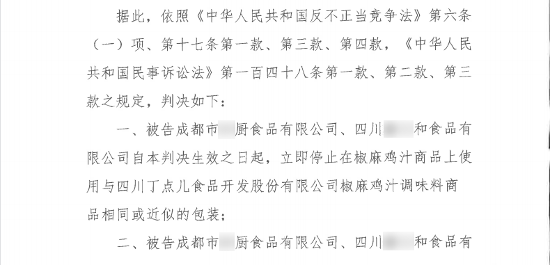 ? ? ? ?2020年11月30日,成都市中級人民法院一審判決丁點兒股份訴成都市某廚食品有限公司、四川某和食品有限公司不正當競爭維權(quán)案勝訴。