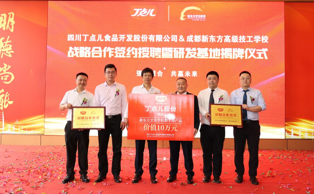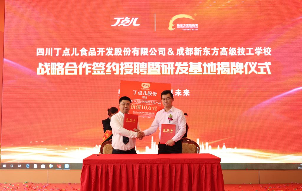 ? ? ? ? 為進(jìn)一步深化產(chǎn)教融合,加強(qiáng)校企合作,推動(dòng)人才培養(yǎng)模式變革,4月27日上午,四川丁點(diǎn)兒食品開(kāi)發(fā)股份有限公司與成都新東方高級(jí)技工學(xué)校戰(zhàn)略合作簽約暨授聘儀式、研發(fā)基地揭牌儀式在成都新東方烹飪學(xué)校隆重舉行。